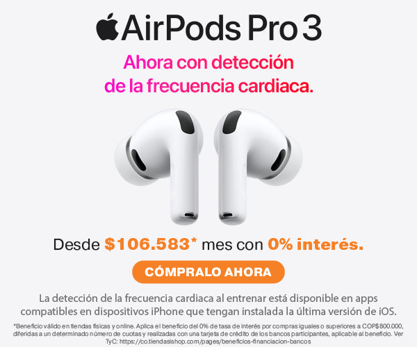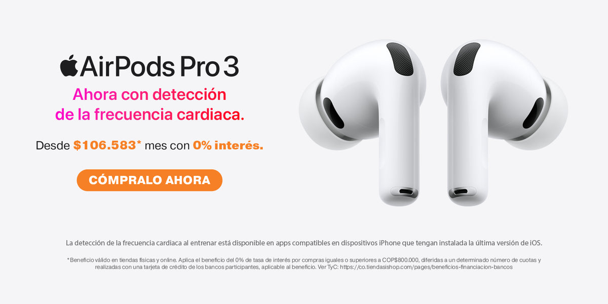 Disfruta de cancelación activa de ruido mejorada, mayor autonomía y una integración perfecta con todos tus dispositivos Apple. Encuentra los AirPods Pro 3 en iShop Colombia, tu tienda Apple autorizada. Compra online o en tienda física con garantía oficial, asesoría especializada y opciones de financiación flexible.