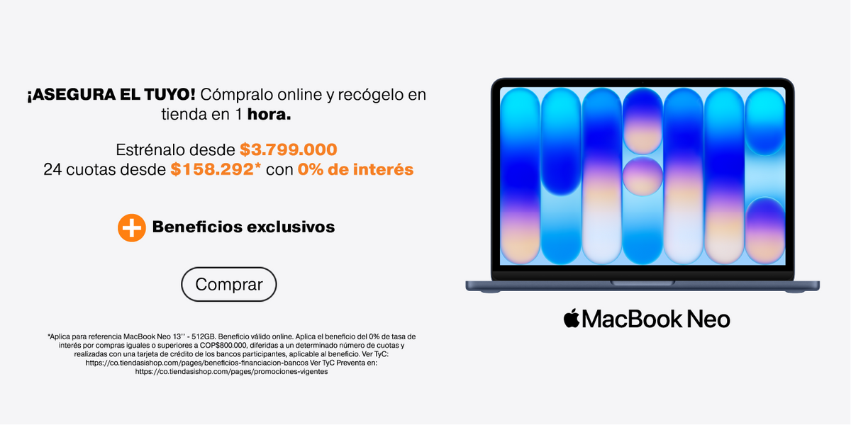 Descubre la nueva MacBook Neo, diseñada para ofrecer velocidad, eficiencia y una experiencia macOS fluida en un formato moderno y versátil. Perfecta para el día a día, estudio y entretenimiento con el respaldo de la calidad Apple. Disponible ahora en iShop Colombia. ¡No te quedes sin la tuya! Compra ahora y sé de los primeros en estrenarla.