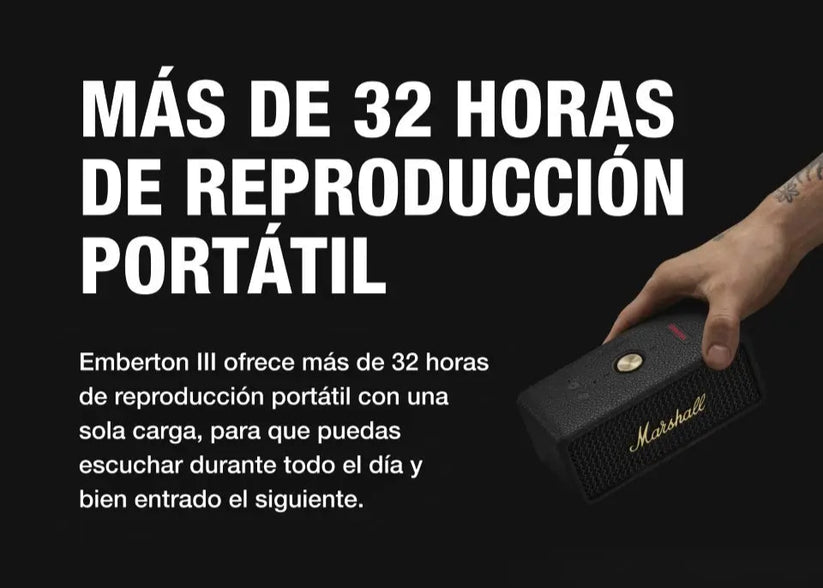 MÁS DE 32 HORAS DE REPRODUCCIÓN PORTÁTIL Emberton III ofrece más de 32 horas de reproducción portátil con una sola carga, para que puedas escuchar durante todo el día y bien entrado el