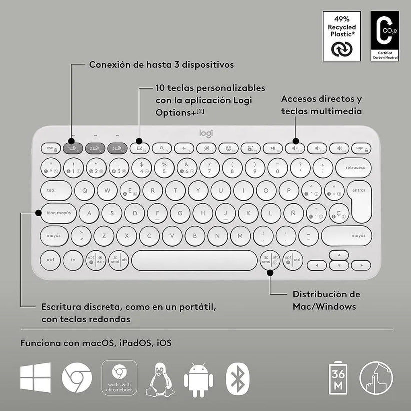- Alterna fácilmente entre 3 dispositivos: Usa Bluetooth para conectar hasta 3 dispositivos inalámbricos con diversos sistemas operativos (Windows, macOS, iPadOS, ChromeOS) y alternar entre ellos con un click de los botones Easy-Switch.